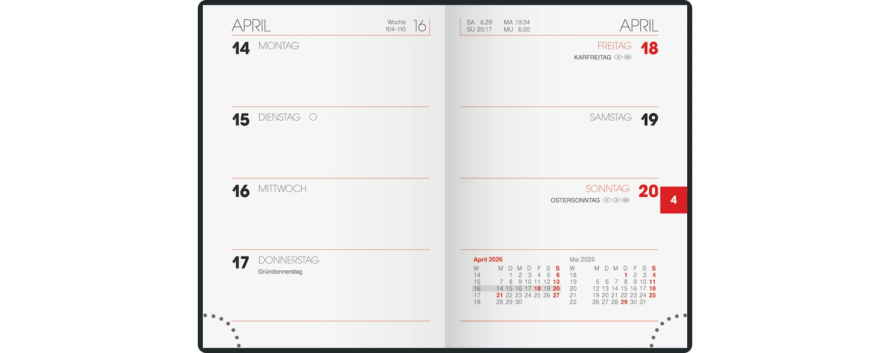 - Ausführung der Kalenderaufteilung: 1 Woche/2 Seiten