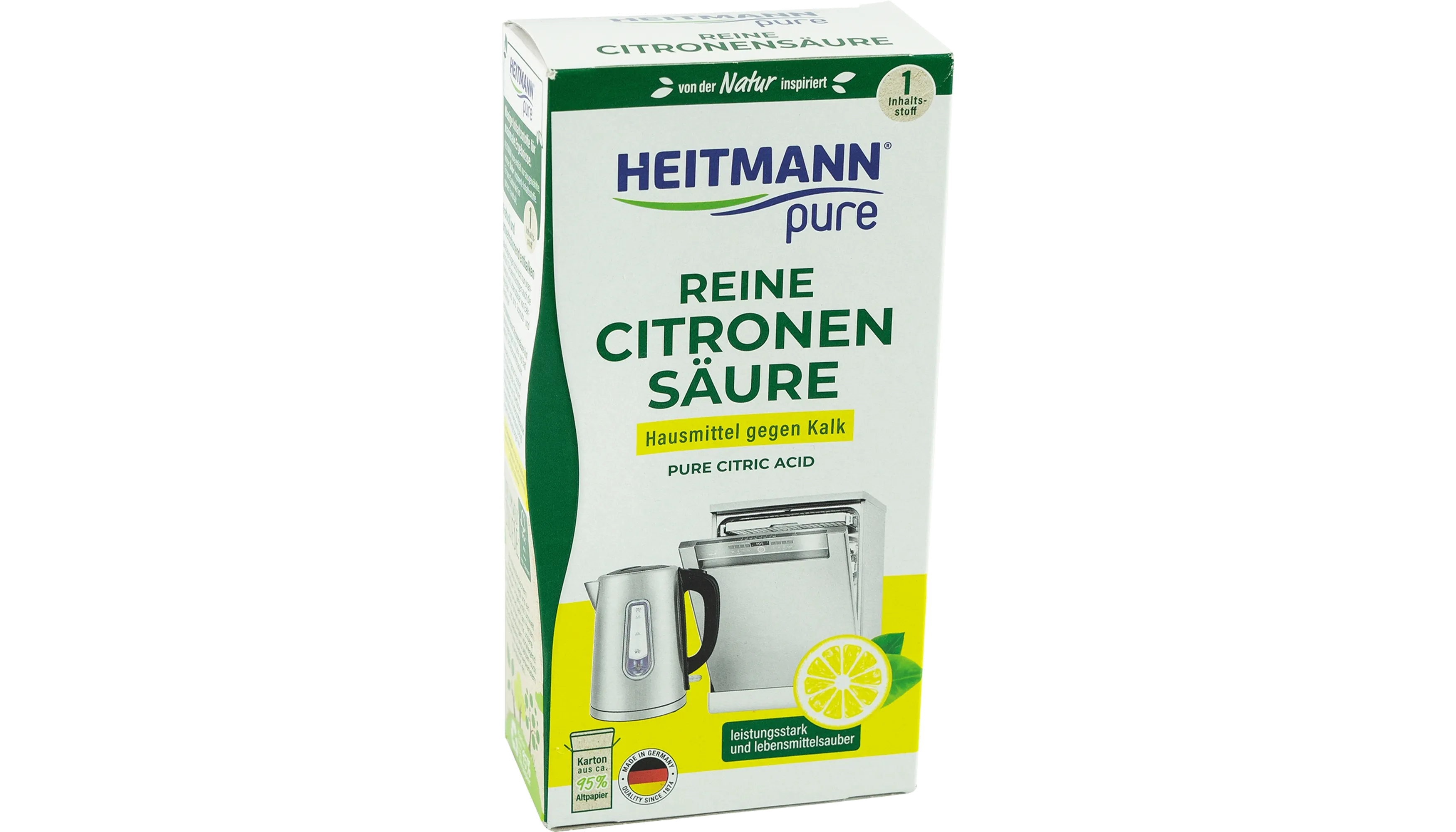 Reine Citronensäure in Wasser gelöst zum lebensmittelsauberen Entfernen von Kalk auf Oberflächen, in Gegenständen und Maschinen. Kalkablagerungen sehen unansehnlich aus. Zudem beeinträchtigen sie die Funktion sowie die Lebensdauer von Elektrogeräten und sind Schmutz- und Keimfänger. Mit der hochwirksamen Citronensäure lösen Sie den Kalk schnell auf und beugen bei regelmäßiger Anwendung neuen Kalkablagerungen vor. Nutzen Sie das vielseitige Hausmittel zum Beispiel zum Entkalken von Wasserkochern, Waschmaschinen oder zur Reinigung von Oberflächen in Küche und Bad. Diese praktische HEITMANN pure Reine Citronensäure ist bereits in Wasser gelöst und sofort einsatzbereit. Die Citronensäurekonzentration der Lösung beträgt 30 Prozent. Die Citronensäure wurde aus natürlichen Ressourcen gewonnen.