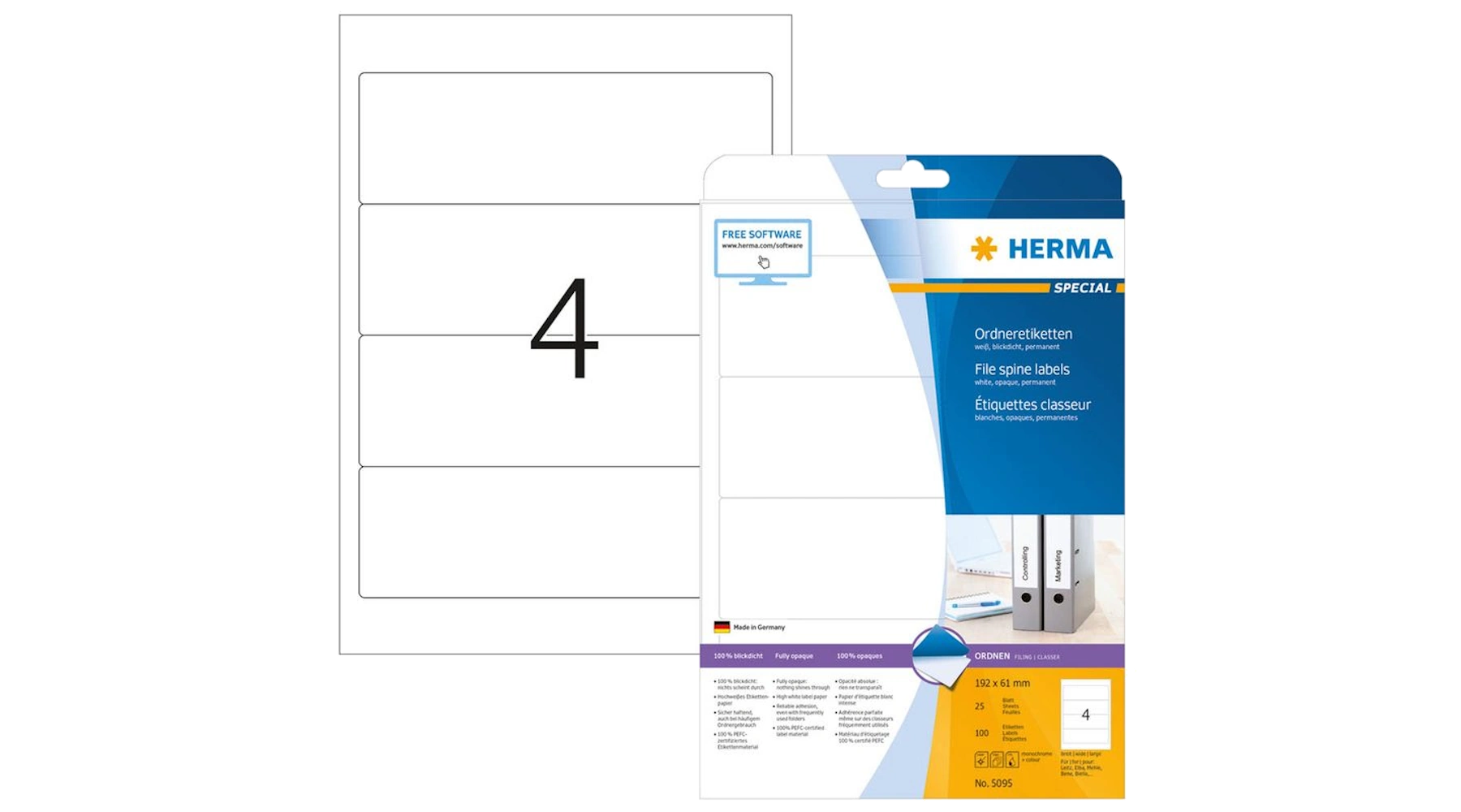 Für alle gängigen Ordner geeignet. Absolut blickdichtes Material mit hohem Weißgrad, alte Ordnerbeschriftungen scheinen nicht durch. Blanko: Ideal für Firmenlogo, Beschriftungen und Ordnungsvermerke. Sicher haftend, auch bei häufigem Ordnergebrauch. Etiketten sind 100 % recyclingfähig mit dem Altpapier, Verpackung aus Recyclingkarton. Kostenlose Softwarelösungen: http://www.herma.de/software. Störungsfreie Verarbeitung durch Rundum-Sicherheitskante und optimale Planlage.