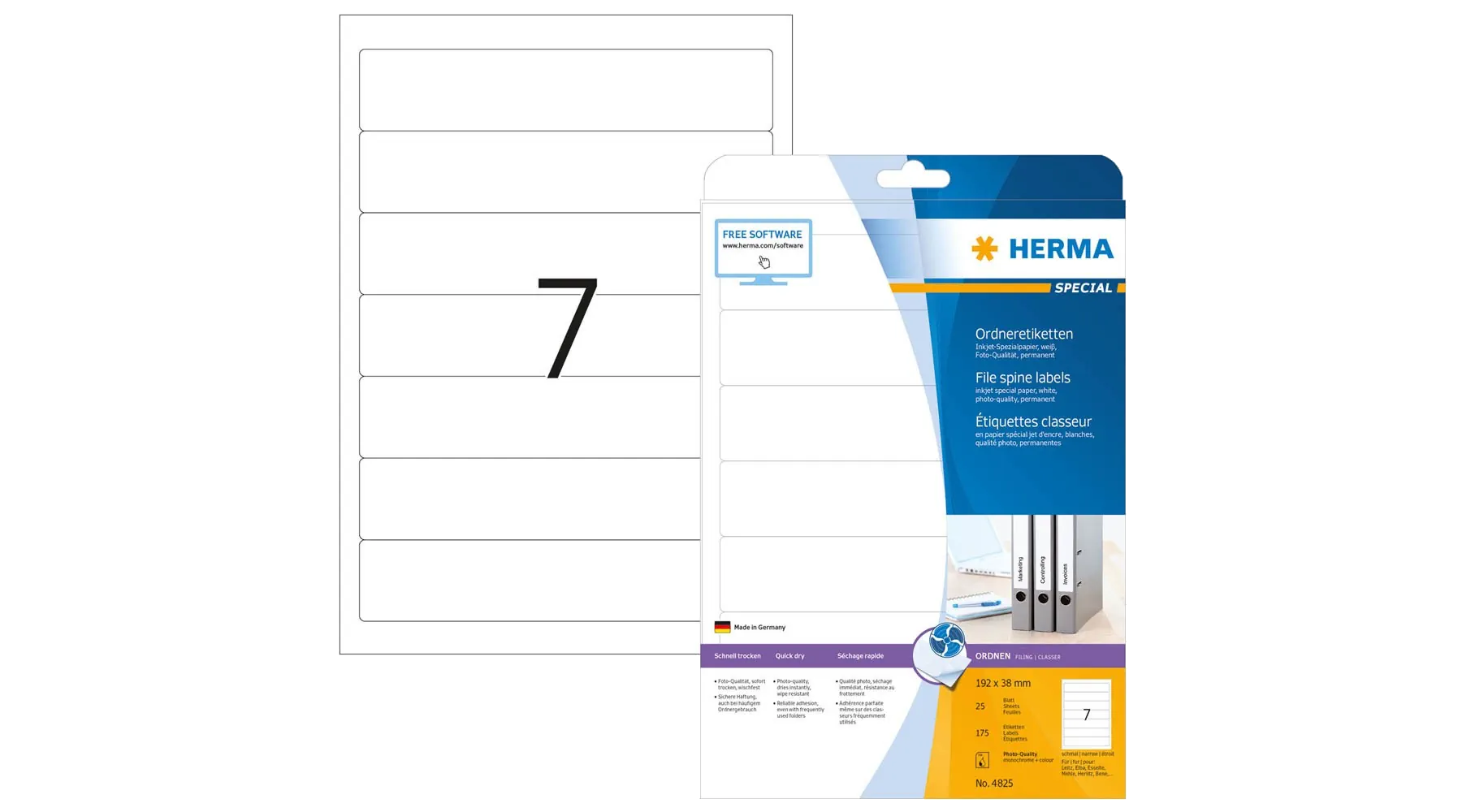 Hervorragende Inkjetdrucke in Schwarz und Farbe. Aus hochwertigem, gestrichenem Spezialpapier. Für farbbrilliante und konturenscharfe Fotoausdrucke. Sicher haftend, auch bei häufiger Verwendung des Ordners. Vollflächig bedruckbar und ideal auch für Inkjetdrucker mit kritischen Papierführungen. Störungsfreie Verarbeitung durch Rundum-Sicherheitskante und optimale Planlage. Kostenlose Softwarelösungen: http://www.herma.de/software.