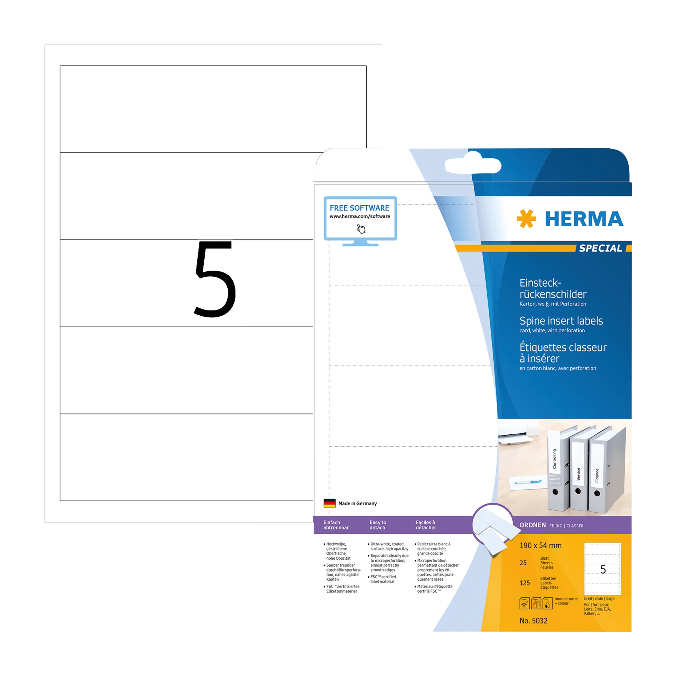 Für Ordner mit Einsteck-/Rückenschildtasche, einfach auszuwechseln. Mit hohem Weißgrad, alte Ordnerbeschriftungen scheinen nicht durch. Ideal für Firmenlogo, Beschriftungen und Ordnungsvermerke. Etiketten sind aus 100 % recyclingfähigem Altpapier. Verpackung ist aus Recyclingkarton. Störungsfreie Verarbeitung durch Rundum-Sicherheitskante und optimale Planlage. Kostenlose Softwarelösungen: http://www.herma.de/software.