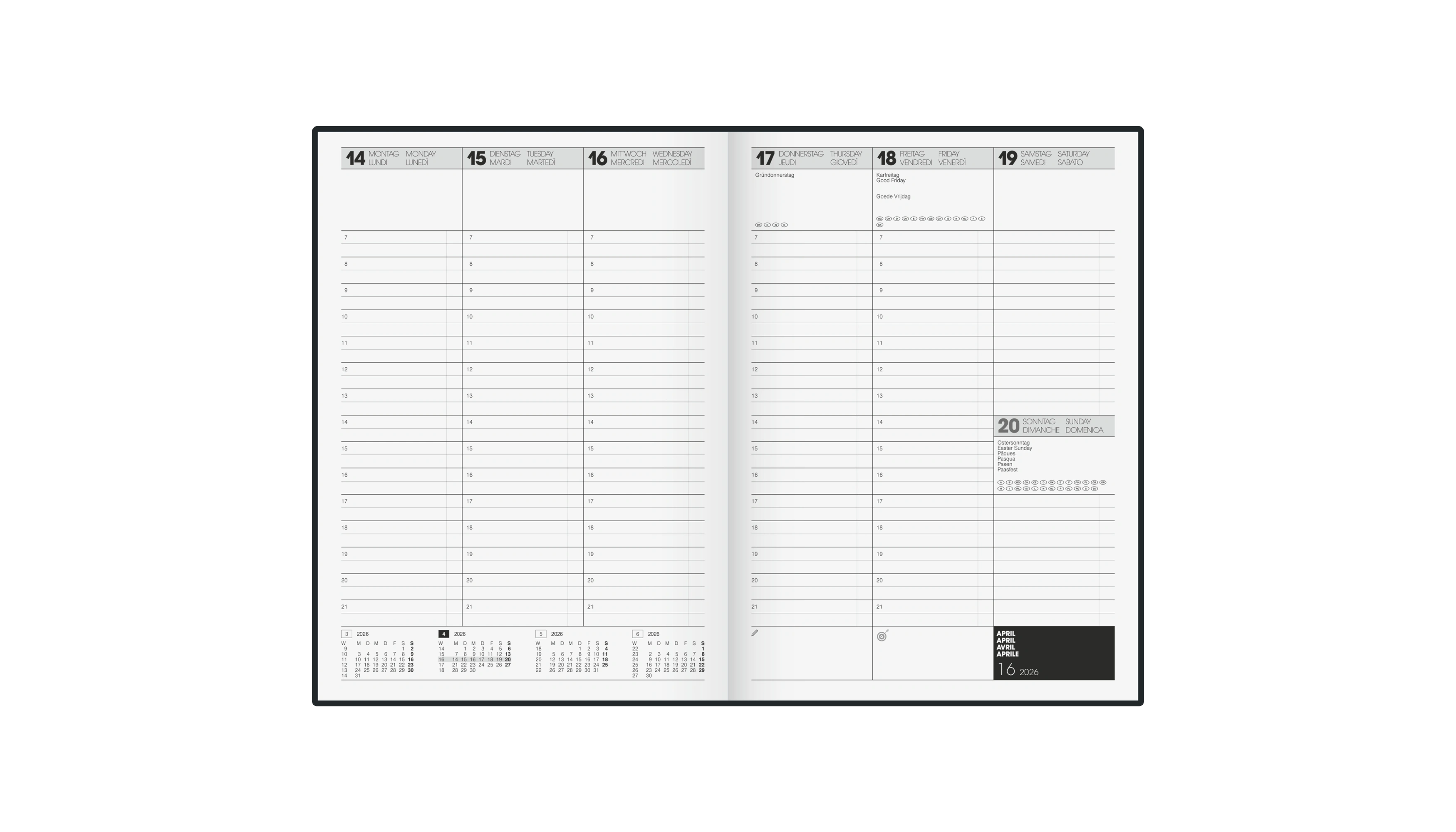 - Ausführung der Kalenderaufteilung: 1 Woche/2 Seiten