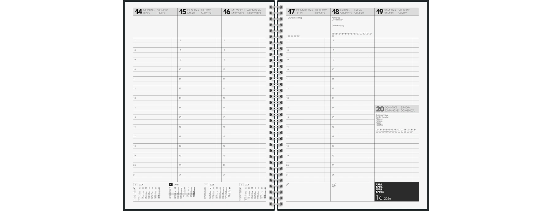 - Ausführung der Kalenderaufteilung: 1 Woche/2 Seiten