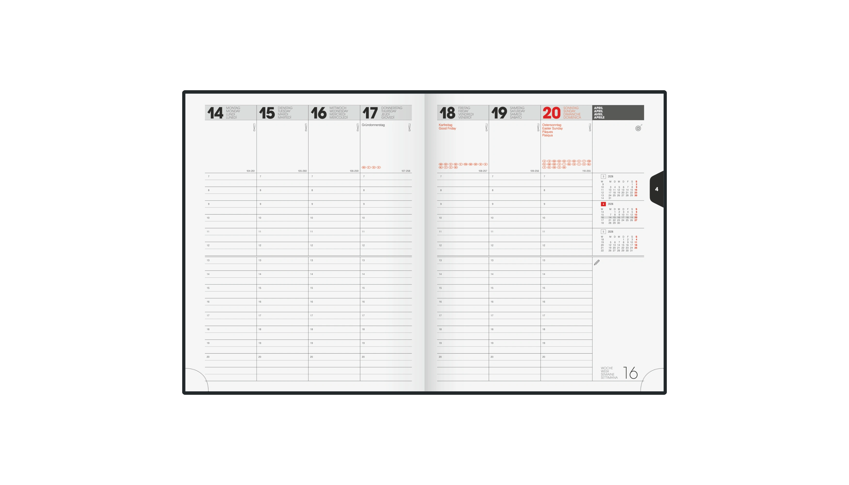 - Kalenderaufteilung: 1 Woche/2 Seiten