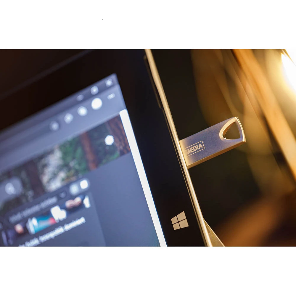 Der schicke und zeitlose USB-Stick MyAlu von MyMEDIA besteht aus einem robusten Vollmetallgehäuse mit nur 6,0 g Gewicht. Der silberfarbene Stick besitzt eine große Schlüsselringöse, zum praktischen Befestigen am Schlüsselbund. Somit haben Sie Ihre Daten immer und überall dabei, und können die Daten zuverlässig transportieren bzw. Datenübertragungen flexibel einsetzen - so haben Sie auch die Möglichkeit jederzeit etwas abzuspeichern oder abzurufen