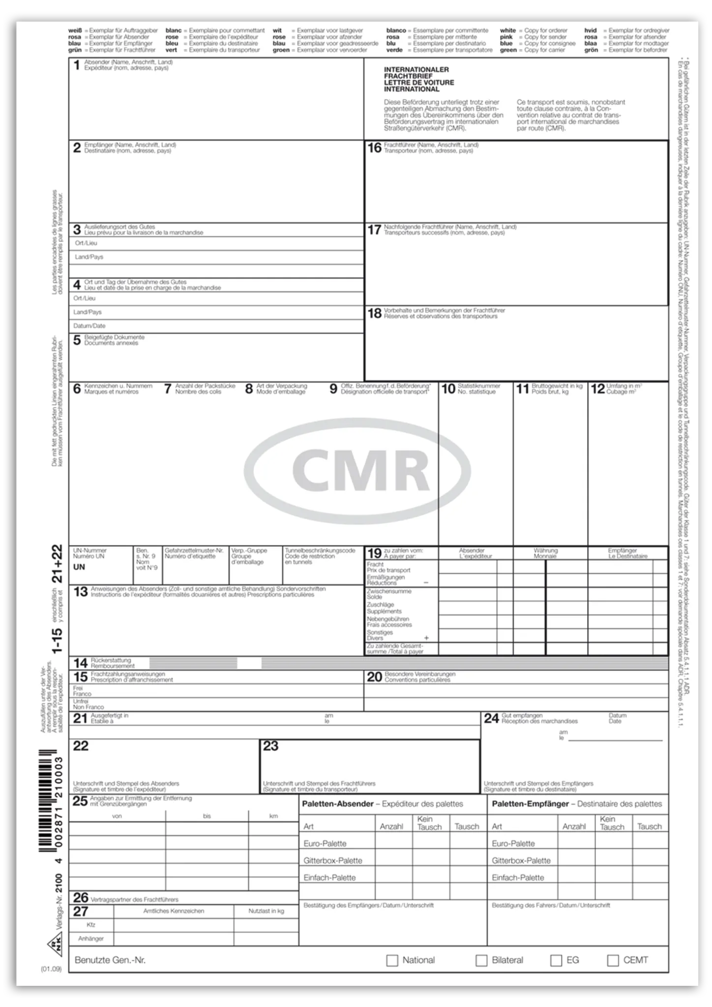 Der CMR-Frachtbrief ist auszufüllen bei internationalen Transporten mit Straßenfahrzeugen, wenn das Abgangs- oder Empfängerland des Versandgutes ein CMR-Mitgliedstaat ist.