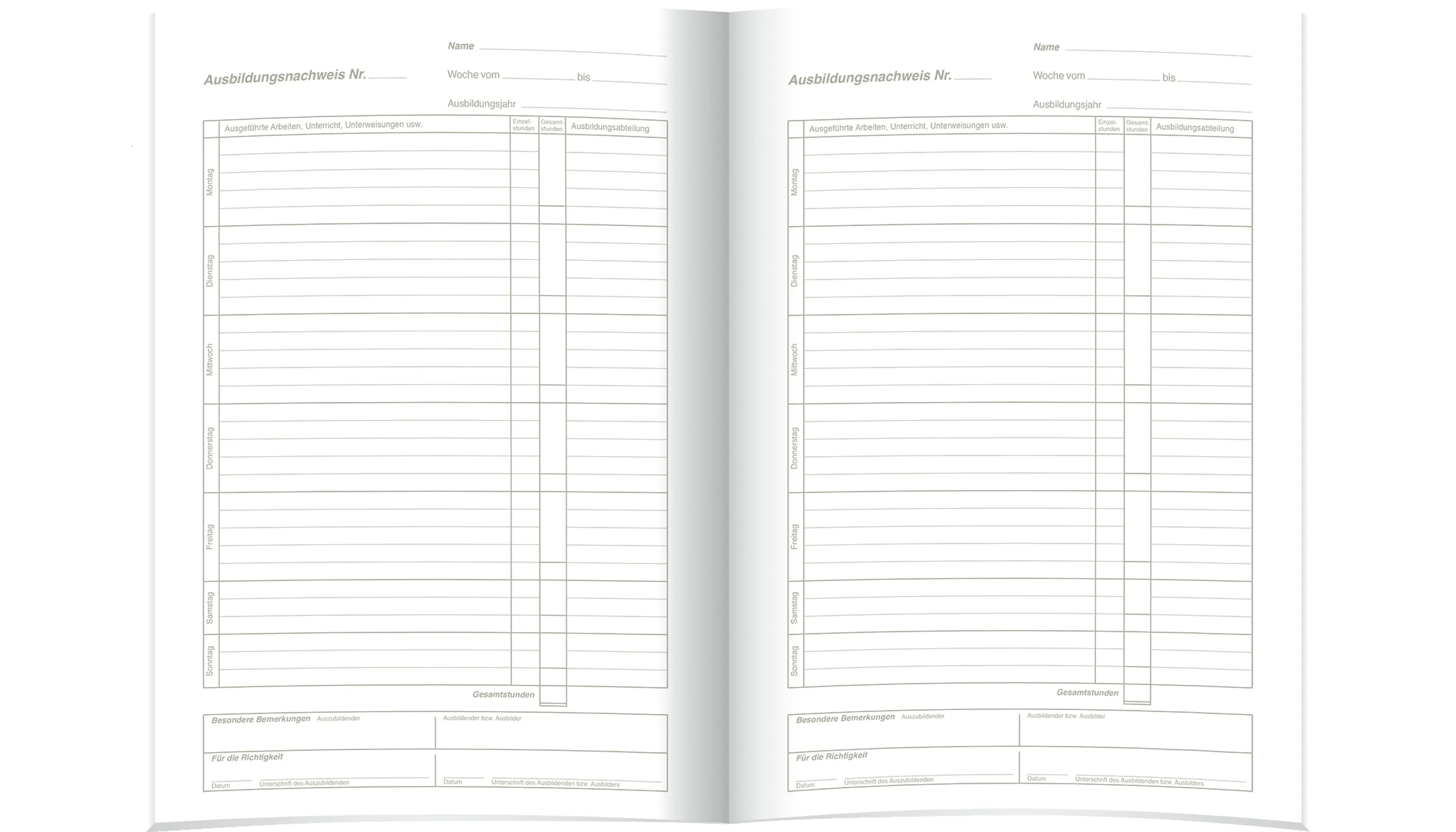Für alle Ausbildungsberufe. Ausbildungszeit von Montag bis Sonntag. Besonderheiten: Erläuterungen und Eintragungsbeispiele, Betrieblicher Ausbildungsplan, Sichtvermerke für Berufsschule, gesetzlichen Vertreter und Betriebsrat.
